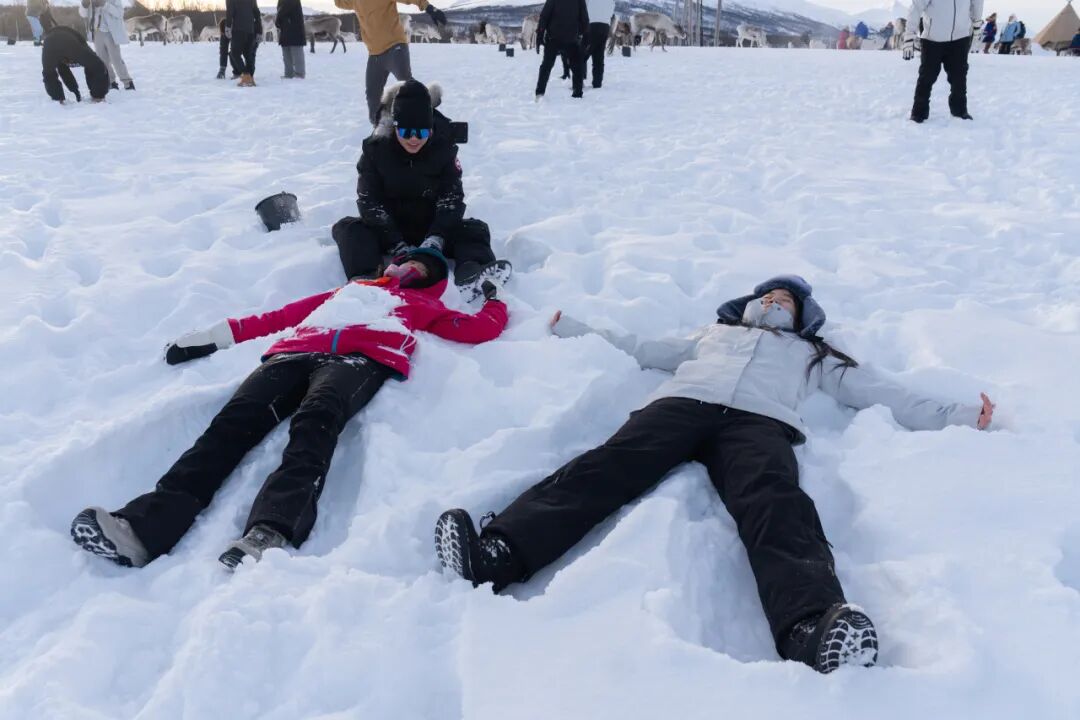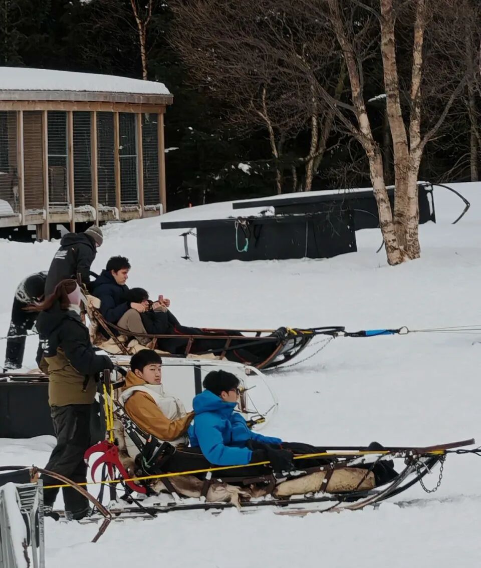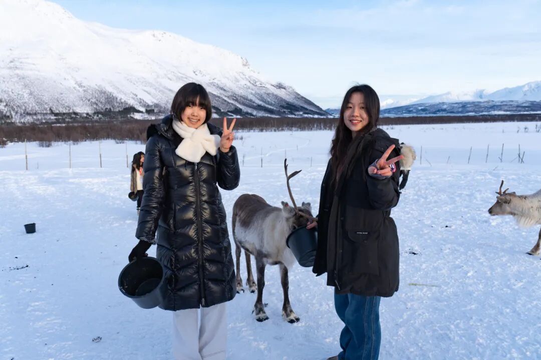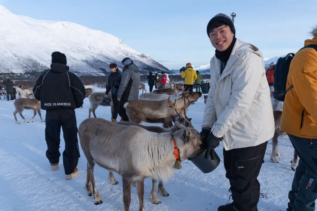 对许多学生来说,此行最难忘的时刻之一,是在挪威北部与萨米族社区的交流学习。通过与当地向导的互动,学生们了解了这一原住民群体的传统文化,以及他们如何在北极环境中生存与发展,并在现代社会中持续守护自身的文化认同。亲手喂养驯鹿、学习可持续牧业,让这些知识变得具体而生动;而第二天的狗拉雪橇体验,则为这段北境探险增添了十足的活力与乐趣。